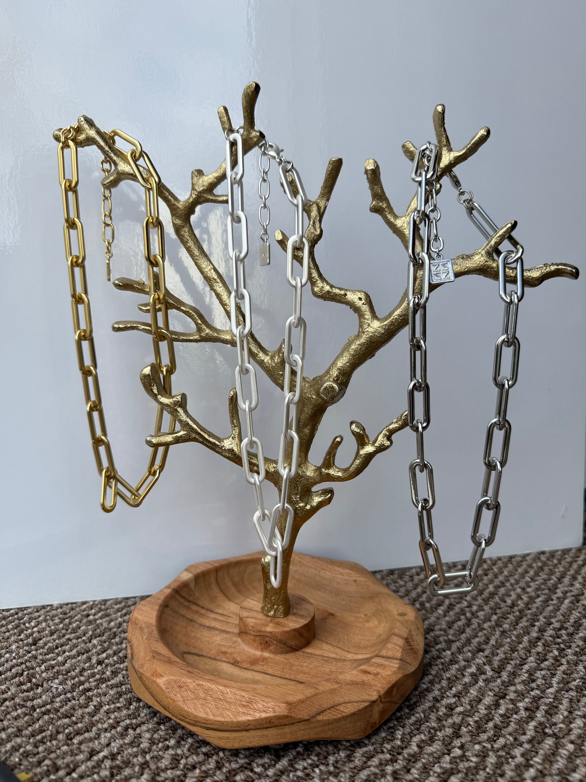 This beautiful, chunky, oblong link-chain collar necklace in shiny silver is a perfect layering piece. This chunky, yet lightweight necklace is a stylish statement piece all by itself… Or a showstopper when layered with any of our other shiny silver necklaces, or ones you already have In your collection! Also available in matte silver and matte gold!
