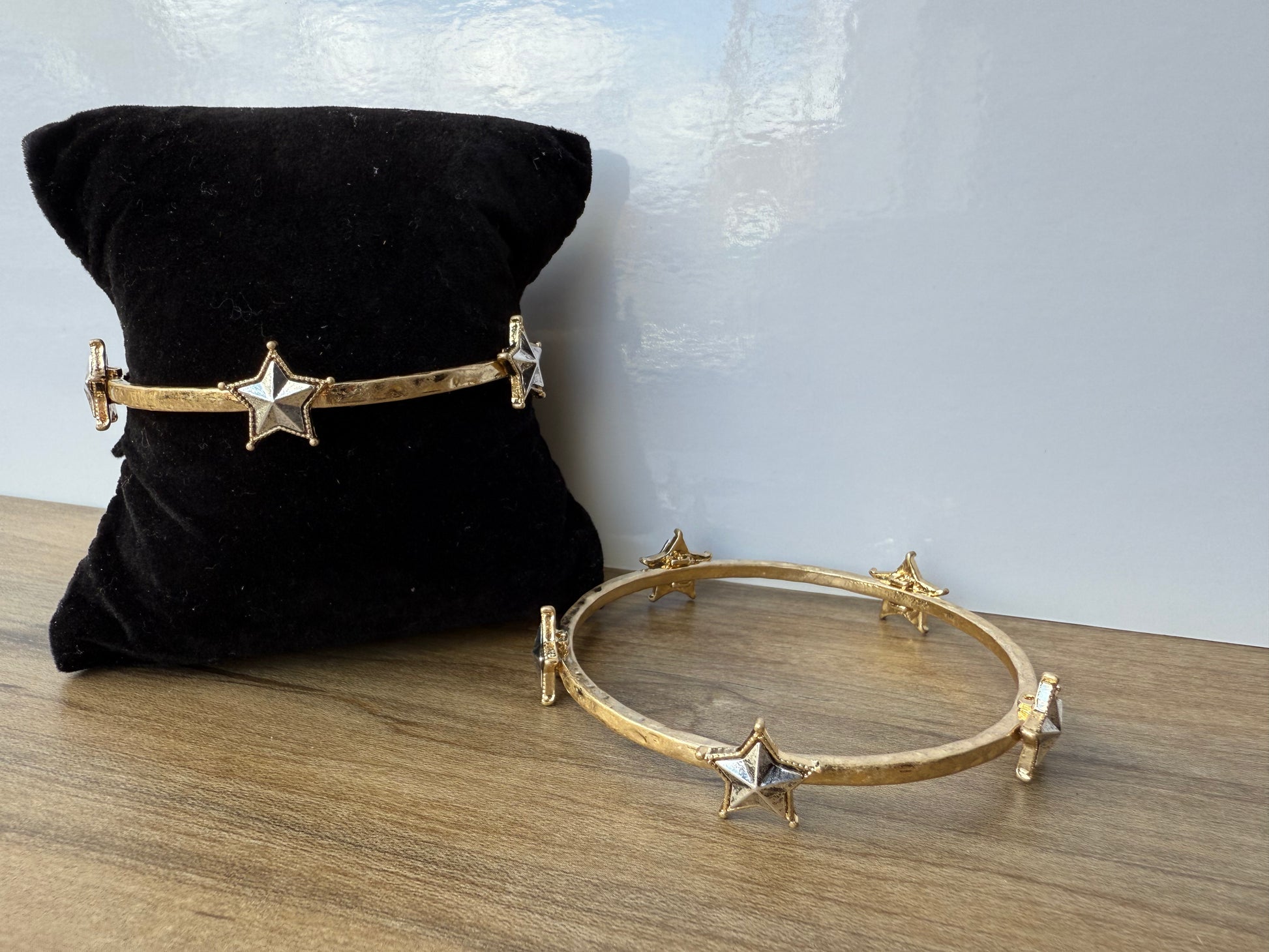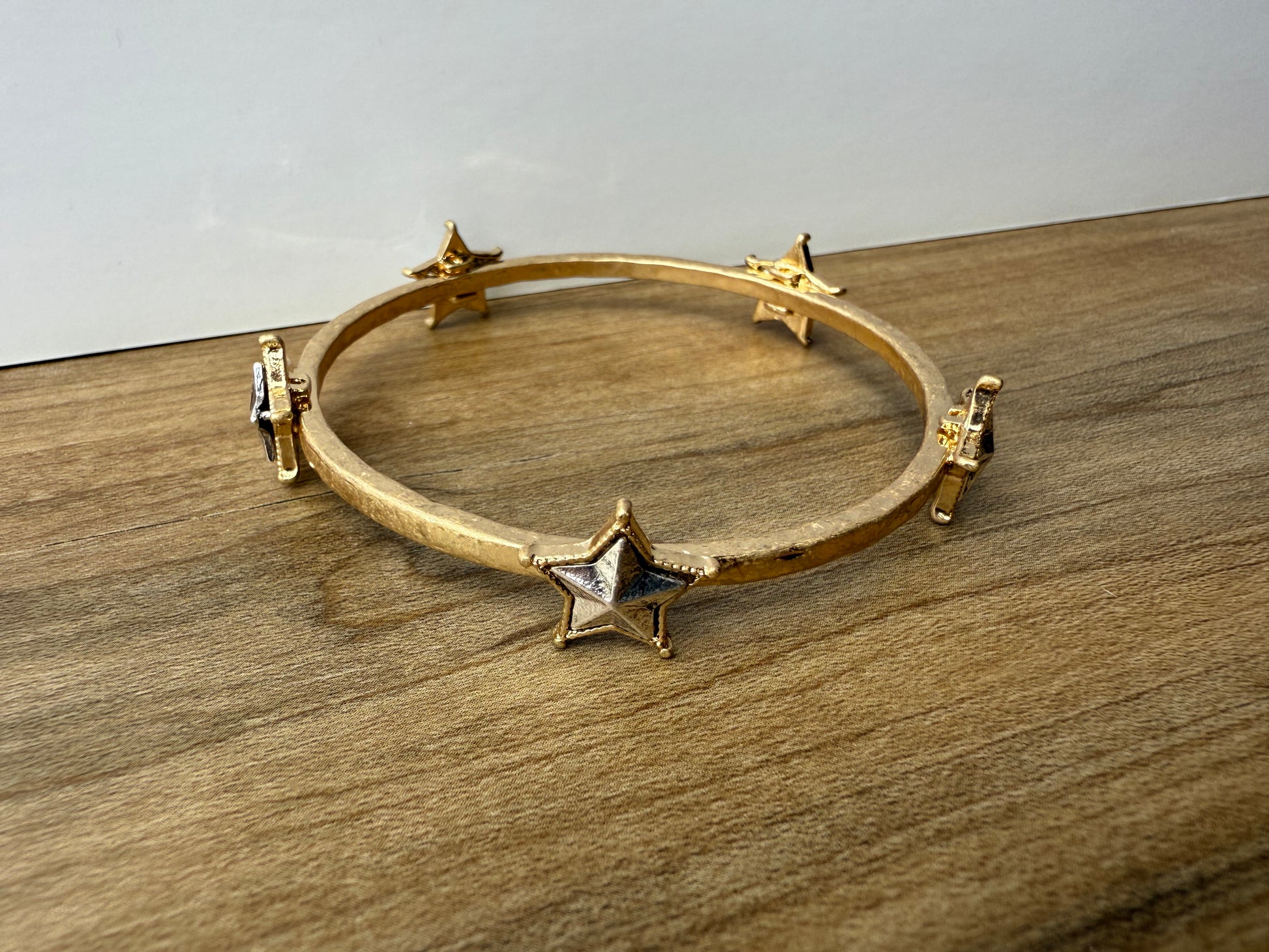 This beautiful star bangle is gold tone with silver accent stars. It is a perfect piece to wear alone or add to your favorite stack!!