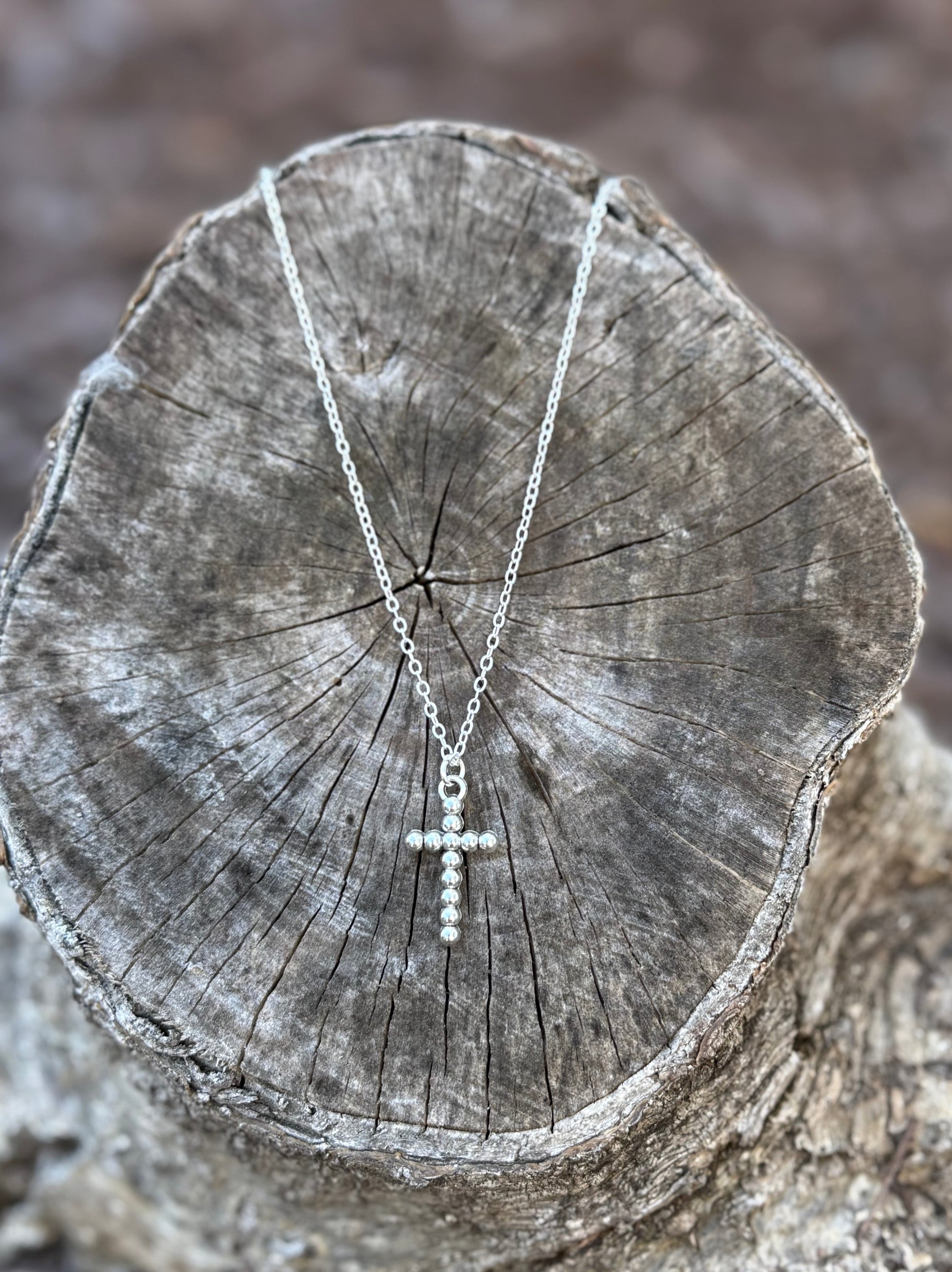 This beautiful Tibetan cross charm pendant hangs daintily from an 18" 1mm .925 sterling silver Rolo chain with a lobster clasp closure. It is perfect for everyday wear either layered or as a solo signature piece.