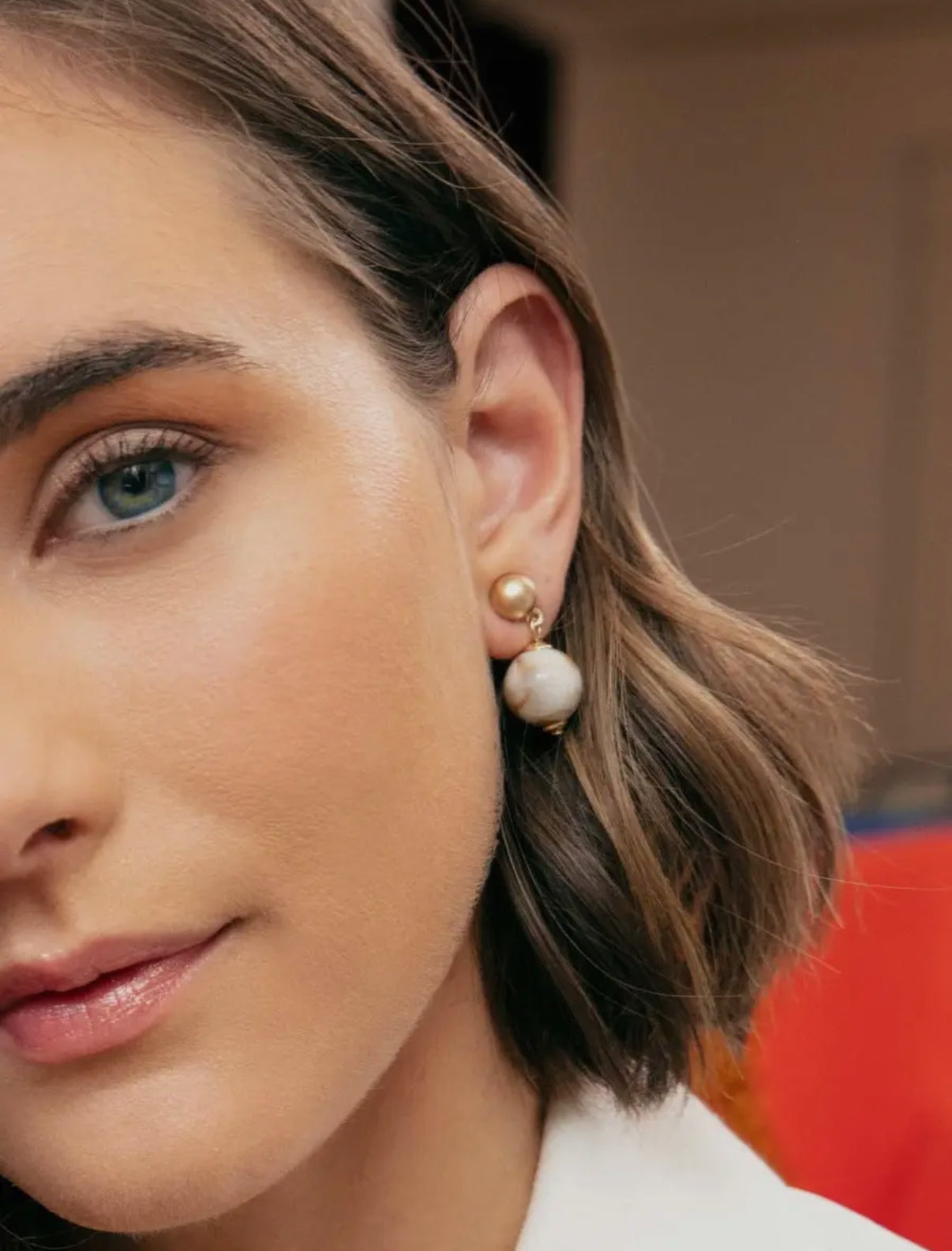 These 18k gold plated post earrings are adorned with beautiful 14mm resin beads, The small drop style makes this an easy earring to go from day to nigh adding the perfect amount of glam to any outfit,