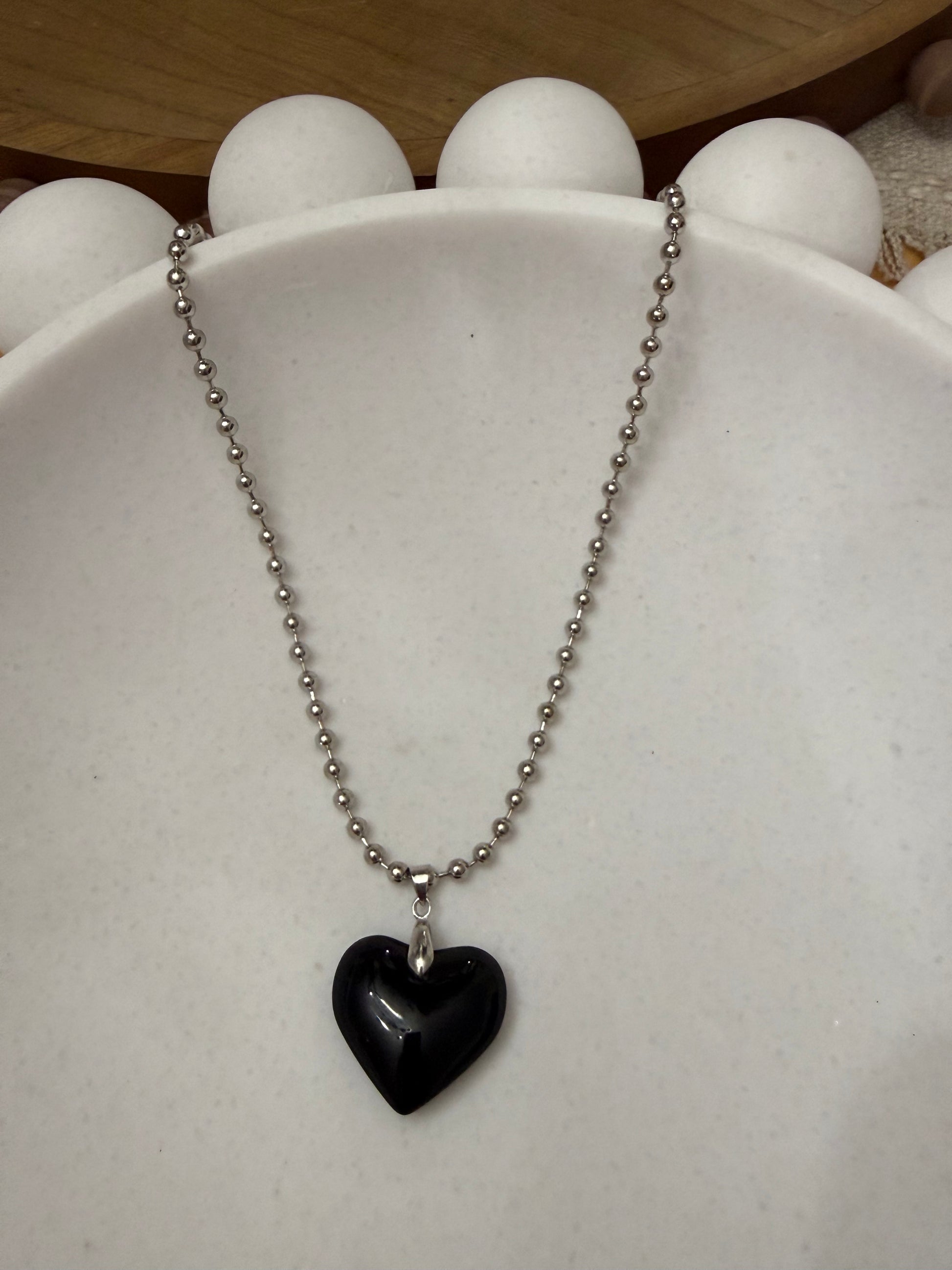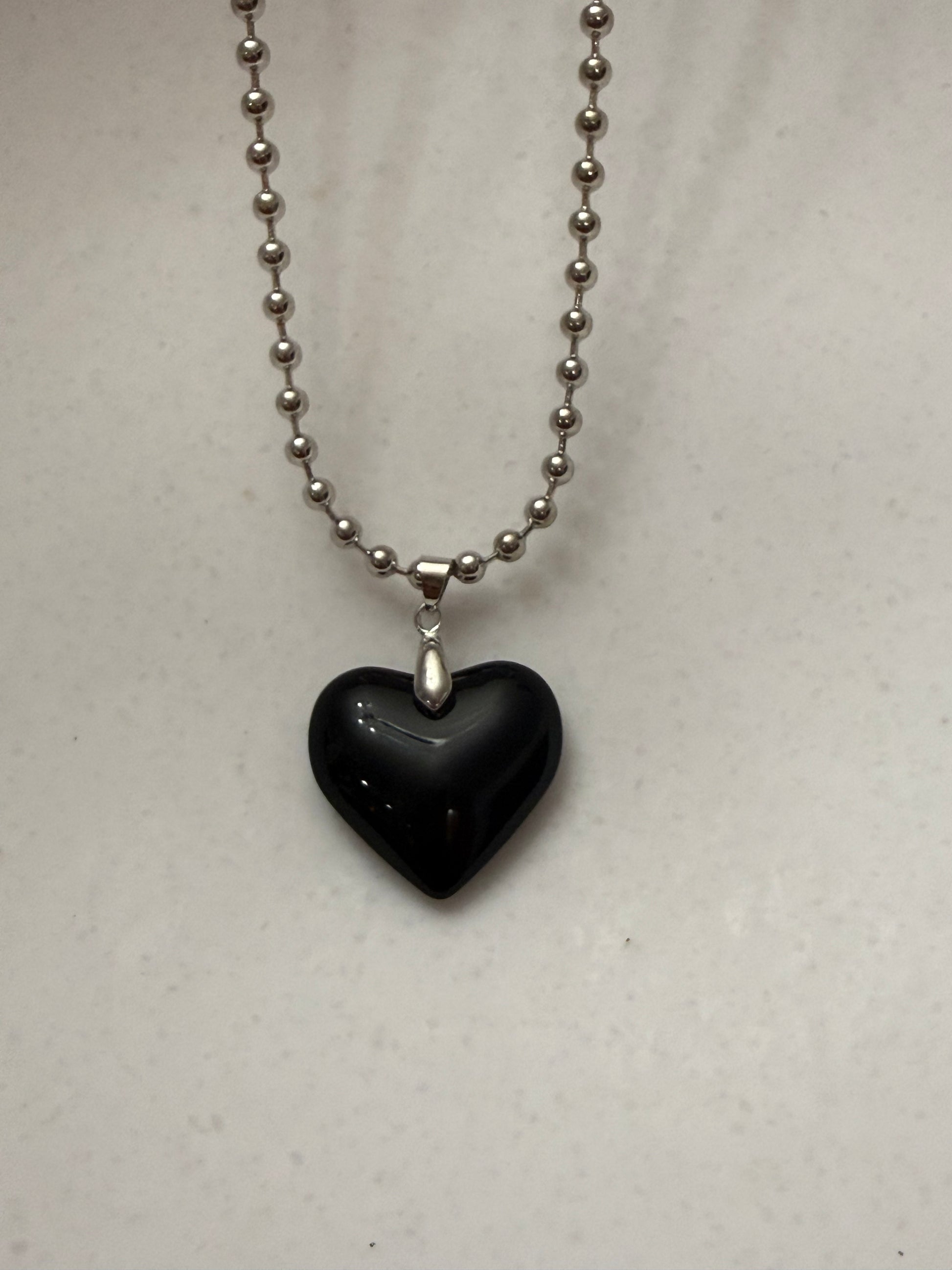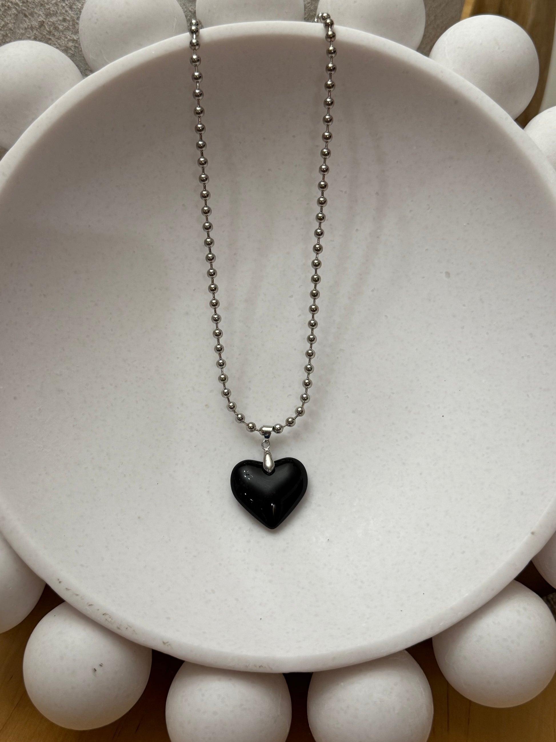 Steel Ball Small Bead Necklace with Black Glass Puffy Heart Pendant